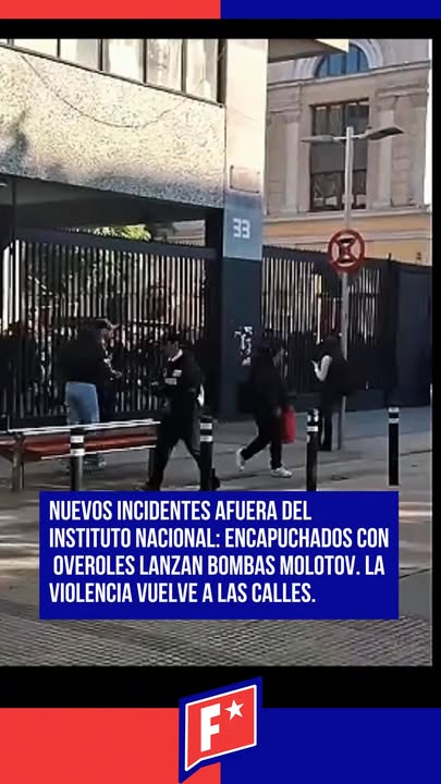 Reportan nuevos incidentes afuera del Instituto Nacional: encapuchados con overoles lanzaron bombas molotov. La violencia no cesa mientras la izquierda justifica a los violentistas. El gobierno de Kast ha dicho basta, pero los mismos de siempre siguen quemando el barrio. Tolerancia cero con el vandalismo.